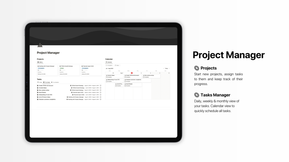 This template was designed to keep you organized and on top of your projects. With the ability to easily organize projects and add tasks, you can keep an overview of your projects at all times. Stay organized with the task calendar and never miss a deadline again. Get a clear task overview for today and this week to stay on top of your workload and achieve your goals. Simplify your workflow and increase your productivity with this powerful task manager.